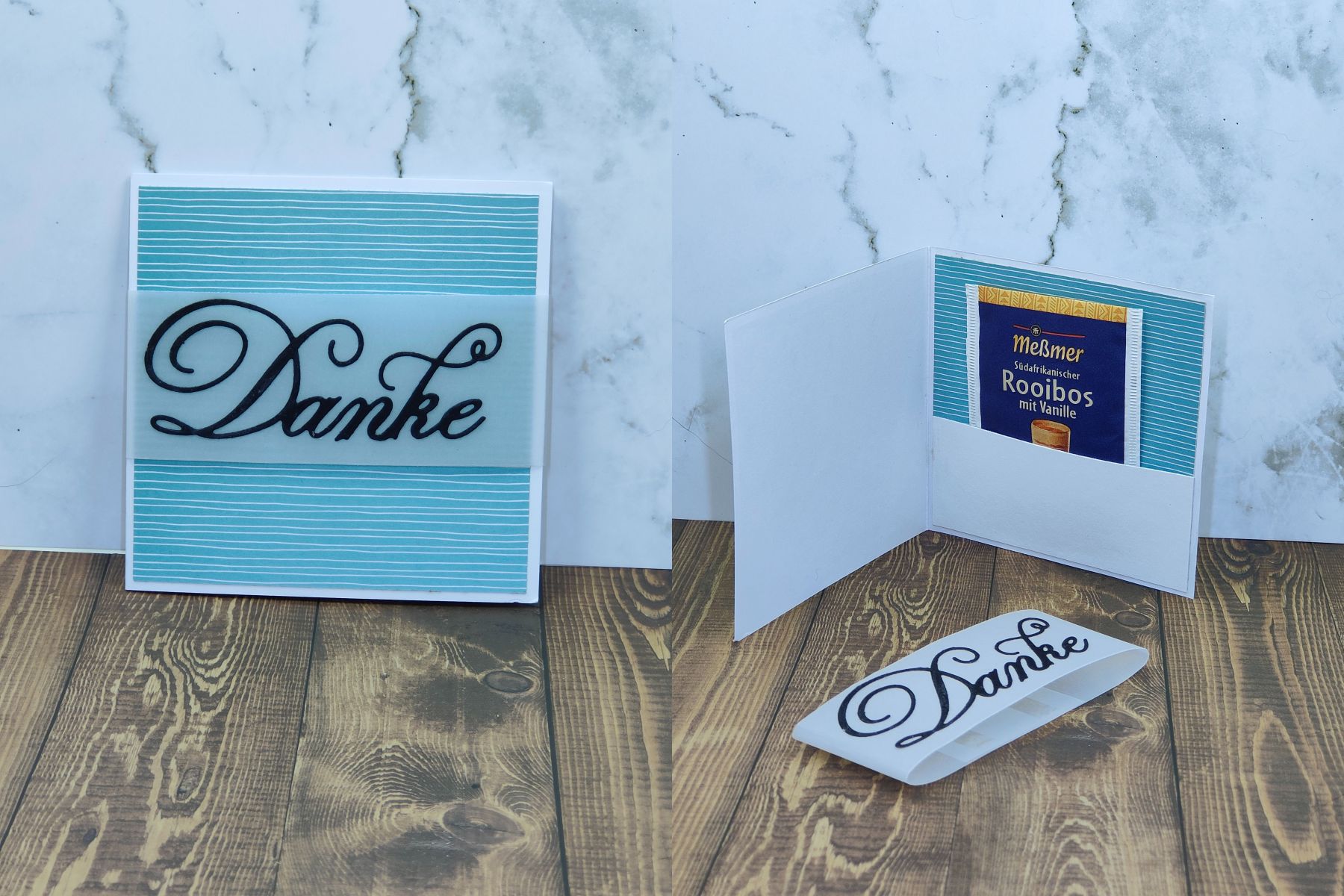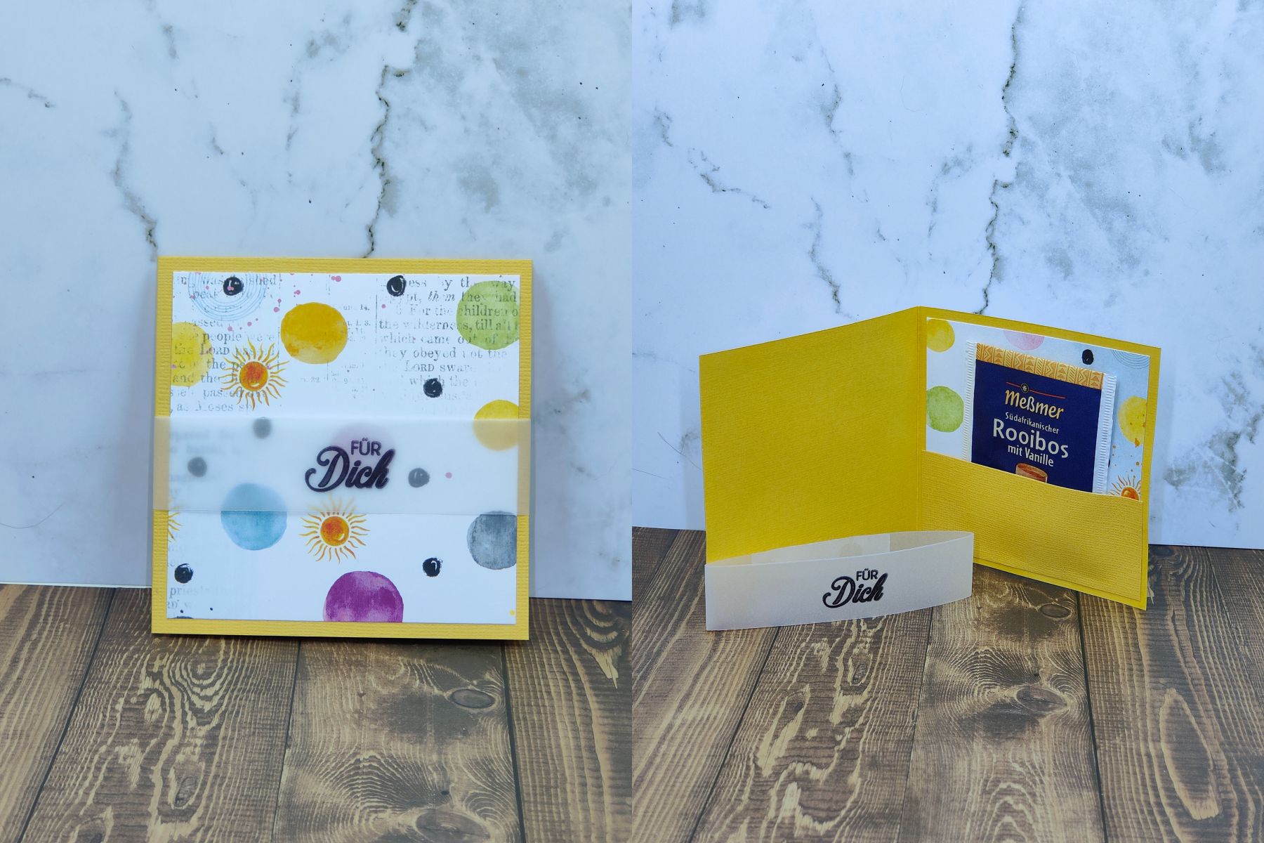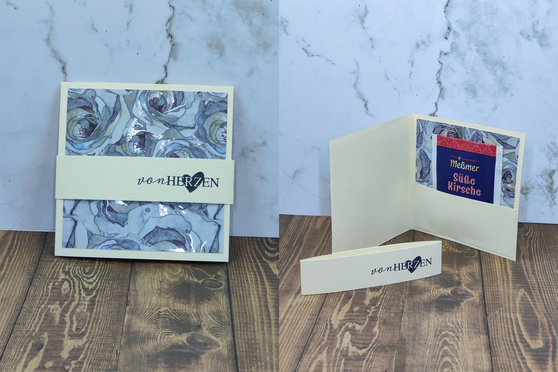 Auch eine Idee als Mitbringsel oder die etwas andere Art von Karte. Es lässt Platz für einen Text, dazu ein Tee und verschlossen mit einem Band oder einer Banderole. Ich wollte etwas mit Teebeutel kreieren, damit die vielen Tee Sorten, (die ich für die Adventskalender jedes Jahr bestelle) noch eine weitere Verwendung finden.